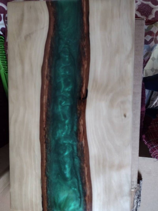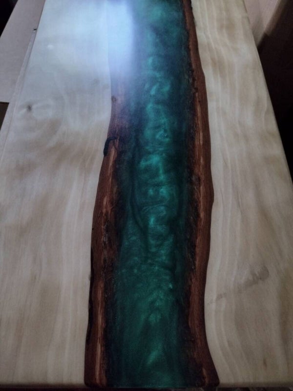 Beautiful handcrafted, food grade resin Charcuterie board. Silver Maple wood, green translucent river. The light shining through it looks stunning. Finger tip grips on the side for easy pick up and moving, this board will be a stand out at your next event.